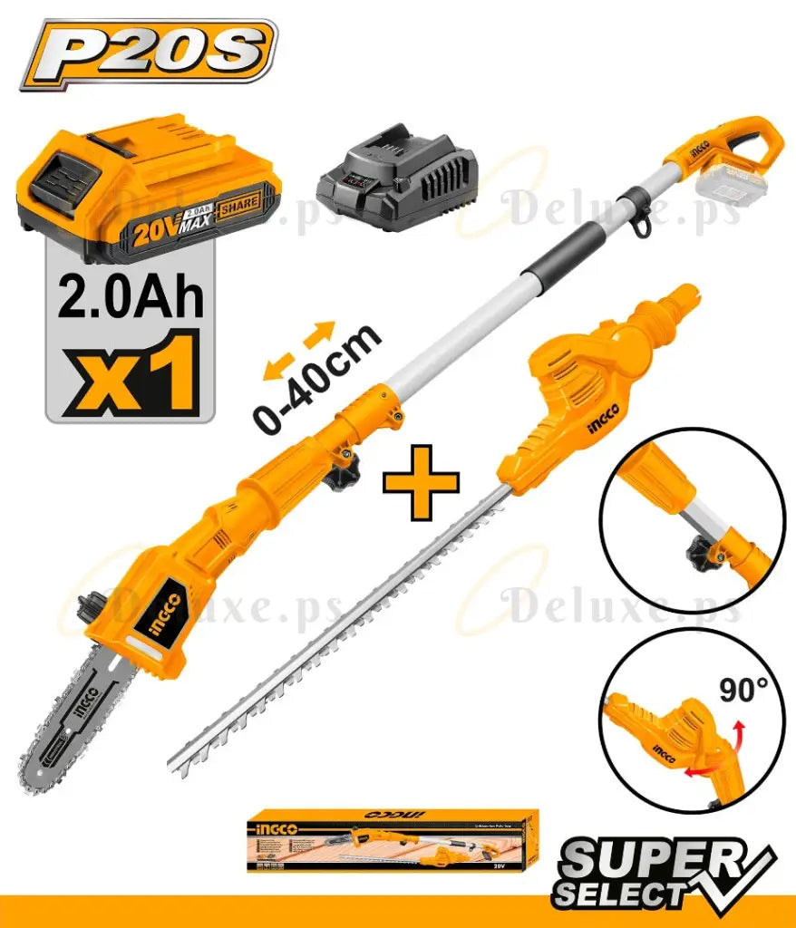 - محتوى الكرتونة : الماكنة مع العمود, قطعة منشار 8 انش, قطعة منجل 18 انش, بطارية واحدة 20 فولت 2 أمبير, شاحن